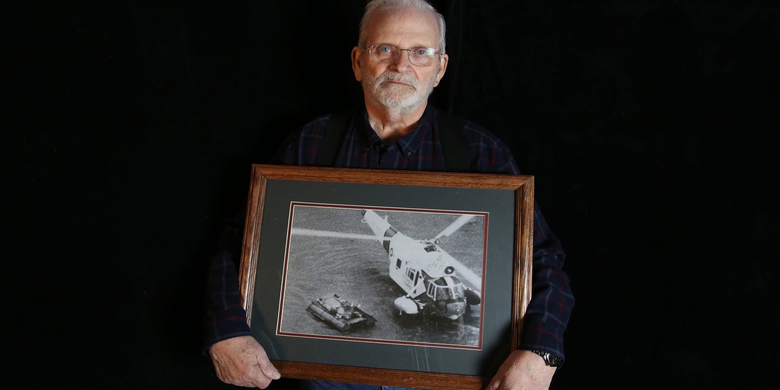 | A photo of Dennis Hale holding a photograph of when he was saved after stranded out in Lake Huron for 38 hours. |